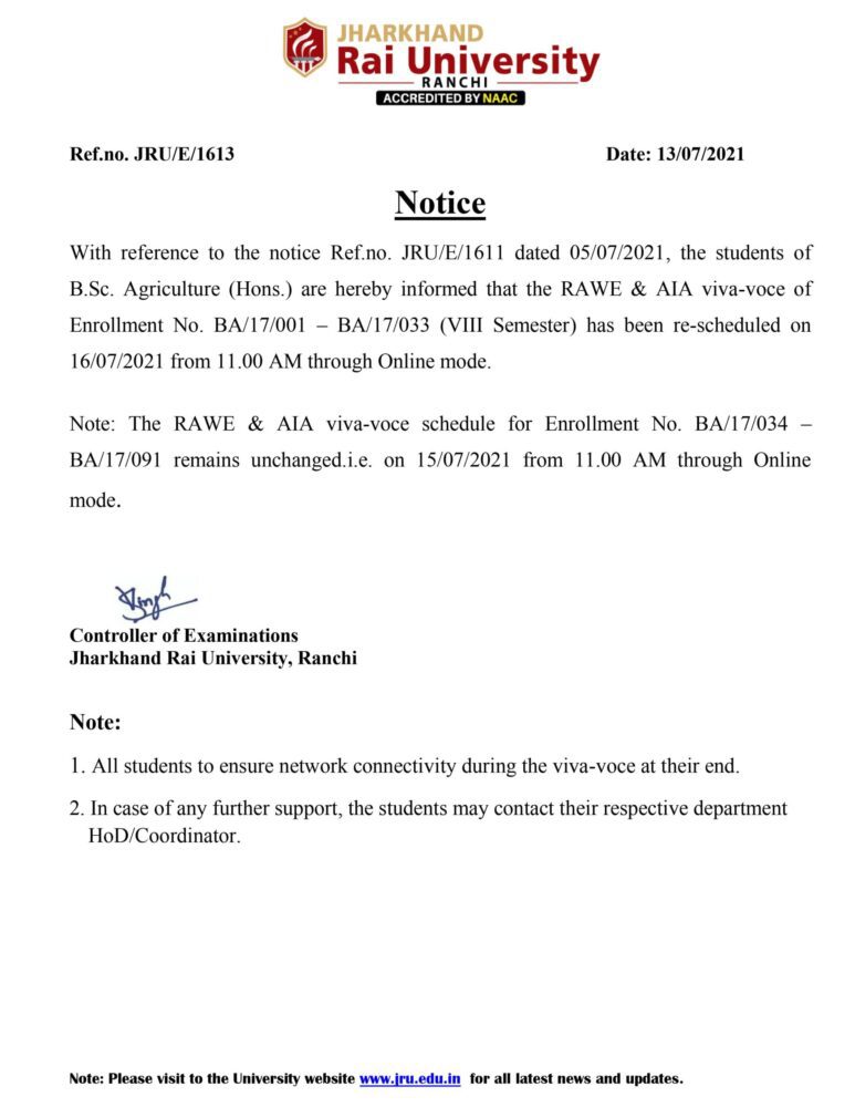 Agri Viva Postpond Notice July 21 - Jharkhand Rai University (JRU), Ranchi
