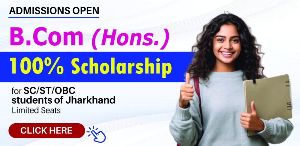 B.Com IMAGE-06 21/06/2024 1000 × 489 झारखंड राय विश्वविद्यालय में बीकॉम पाठ्यक्रम में 100 % छात्रवृत्ति सुविधा