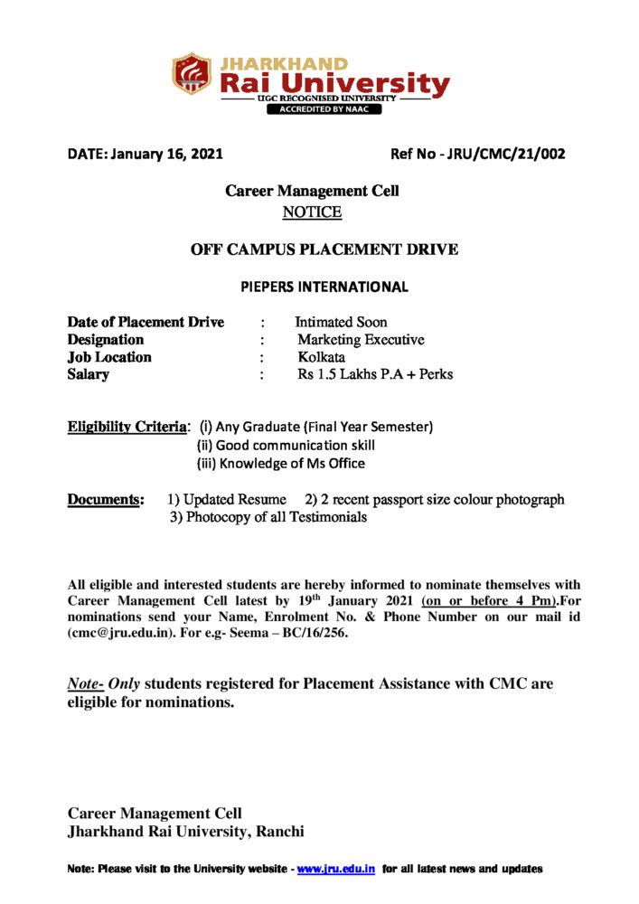 CMC-21-002 PIEPERS INTERNATIONAL_01 - Jharkhand Rai University (JRU), Ranchi
