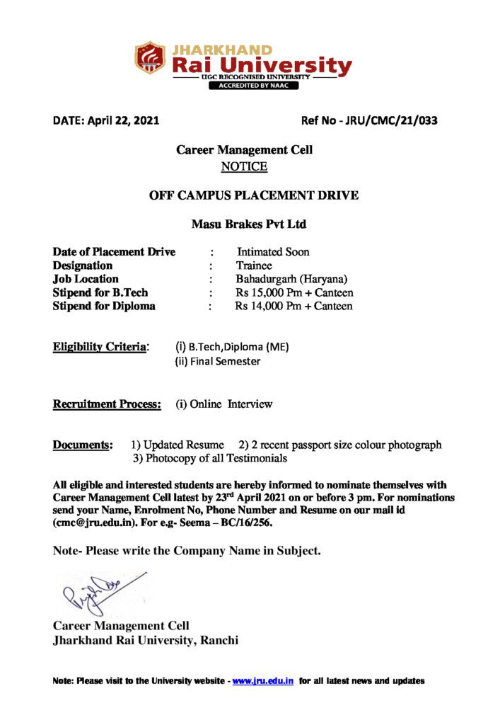 CMC-21-33 Masu Brakes Pvt Ltd_01 - Jharkhand Rai University (JRU), Ranchi