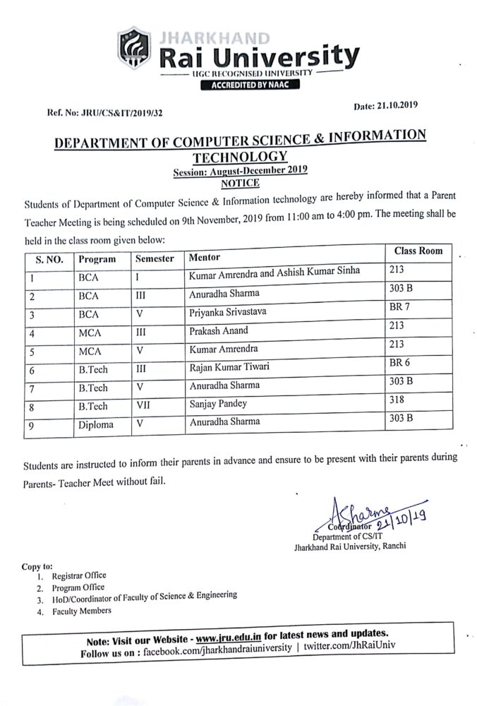 CSIT notice for PTM - Jharkhand Rai University (JRU), Ranchi
