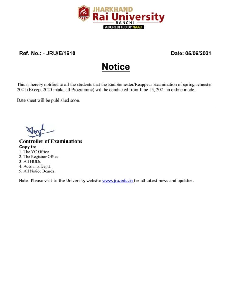 End sem Exam notification Jun 2021 - Jharkhand Rai University (JRU), Ranchi