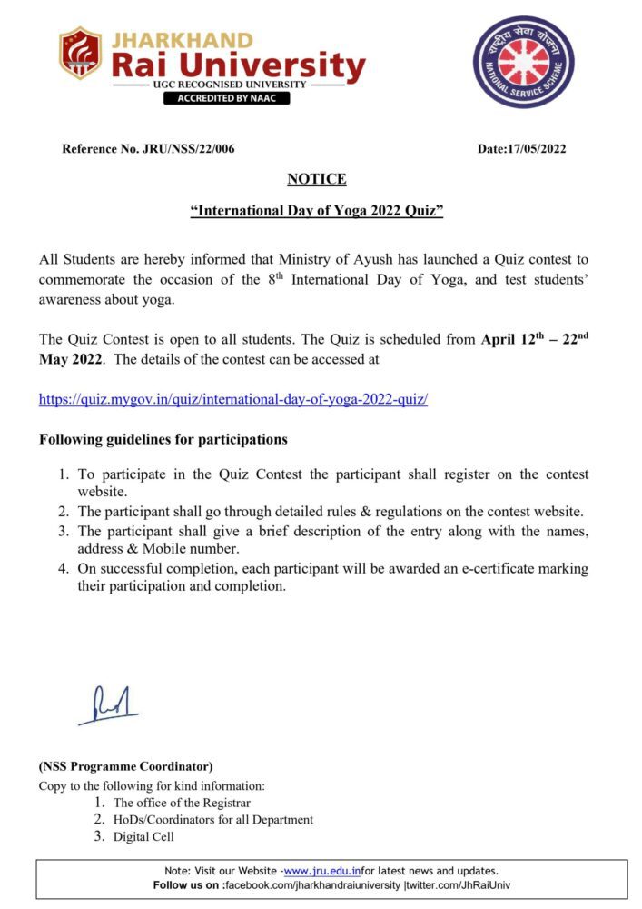 IDY 2022 Quiz Contest - Jharkhand Rai University (JRU), Ranchi