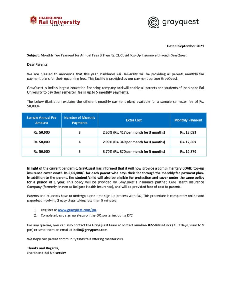 Jharkhand Rai University -EMI Circular - Jharkhand Rai University (JRU), Ranchi