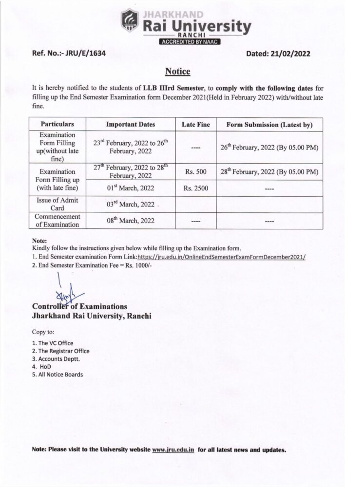 LLB notice - Jharkhand Rai University (JRU), Ranchi