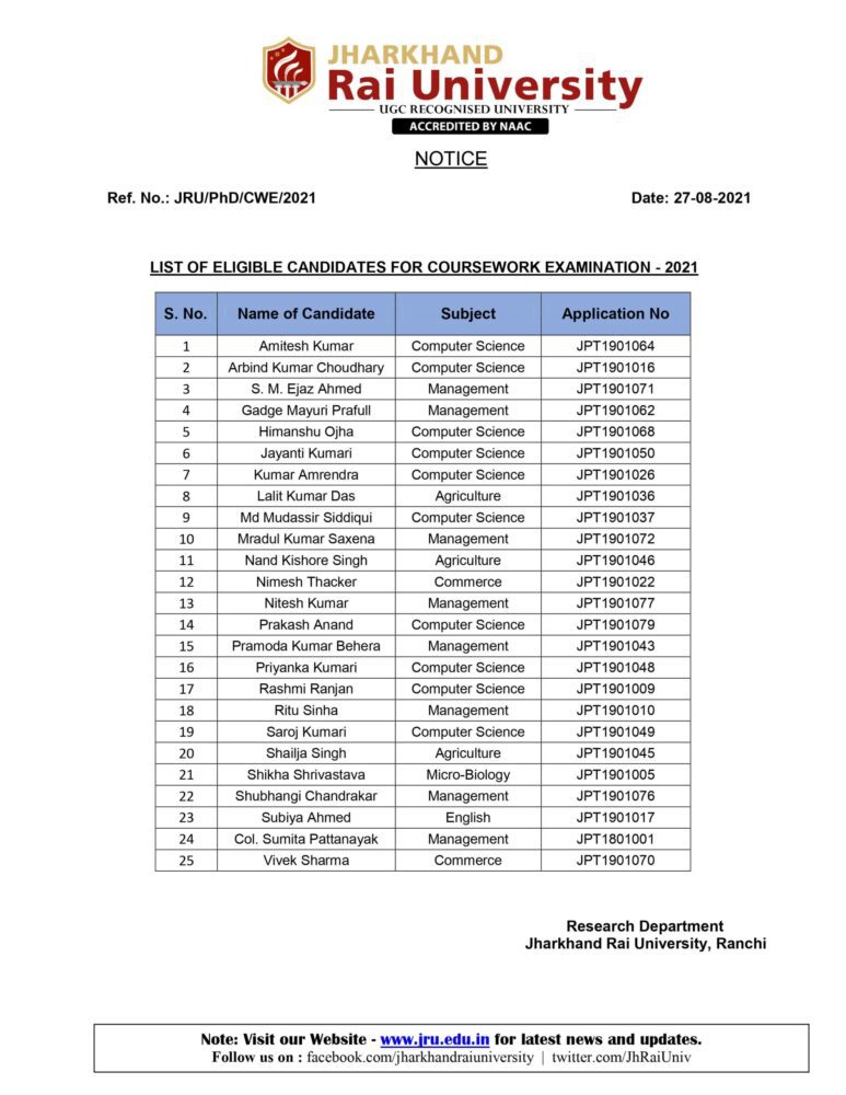 NOTICE CWE 2021 (Eligible Candidates) - Jharkhand Rai University (JRU), Ranchi