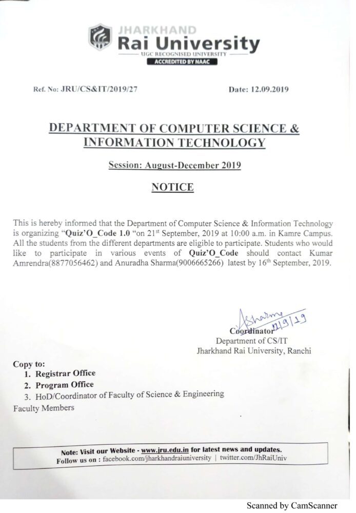 notice for CSIT-quiz-o_code - Jharkhand Rai University (JRU), Ranchi
