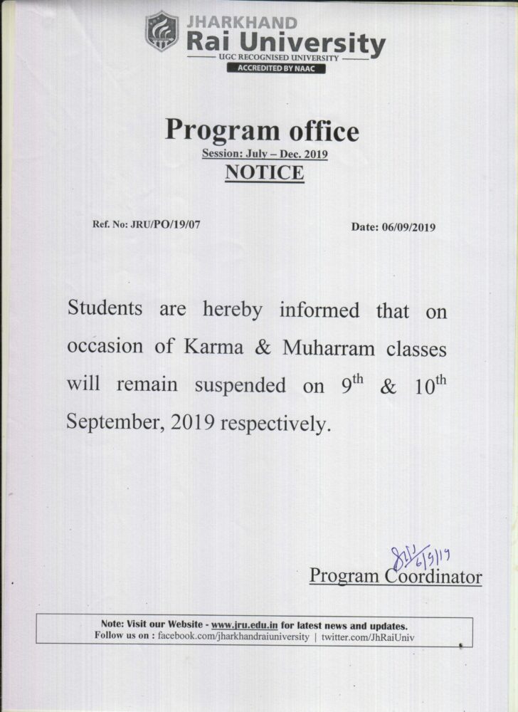 Notice for Karma & Muharram - Jharkhand Rai University (JRU), Ranchi
