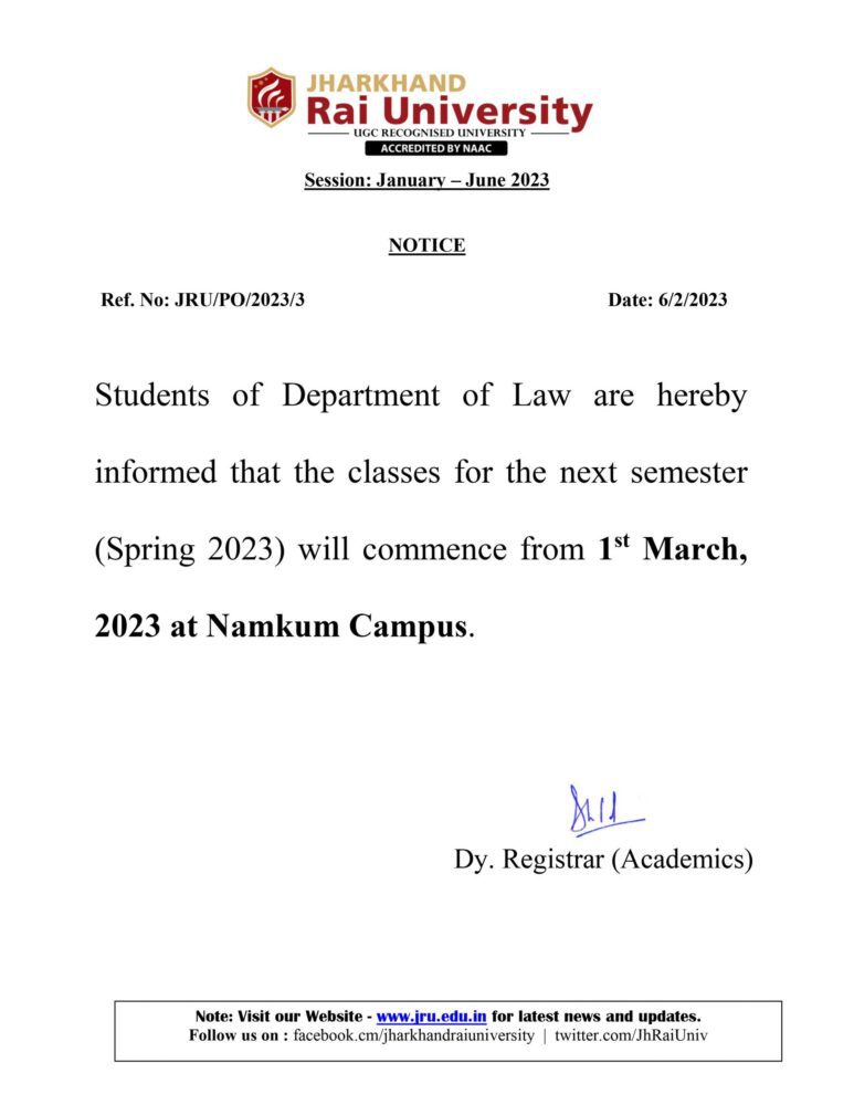 Notice for the Department of Law - Jharkhand Rai University (JRU), Ranchi