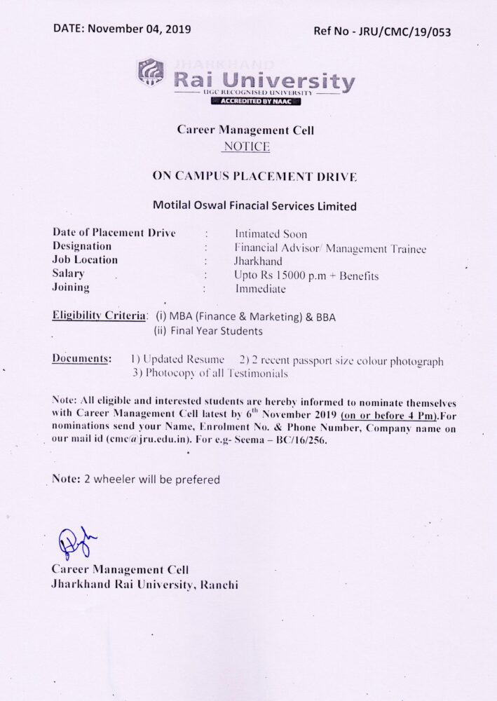 Notice on campus placement ddrive - Jharkhand Rai University (JRU), Ranchi