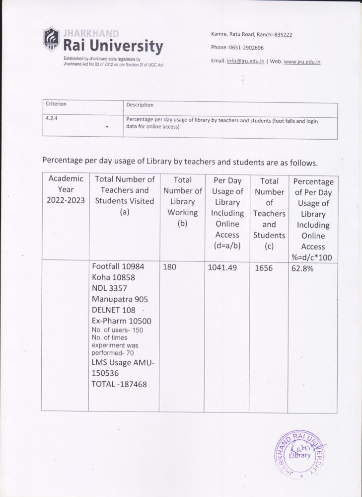 Library Usage Report 30/04/2024 729 × 1000 Percentage per day usage of library by teachers and students ( foot falls and login data for online access) (Data for the latest completed academic year) 2022