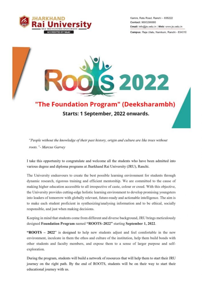 ROOTS - 2022 Letter-0001 - Jharkhand Rai University (JRU), Ranchi