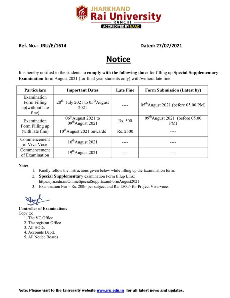 Special Supple Exam Notice August 21 - Jharkhand Rai University (JRU), Ranchi