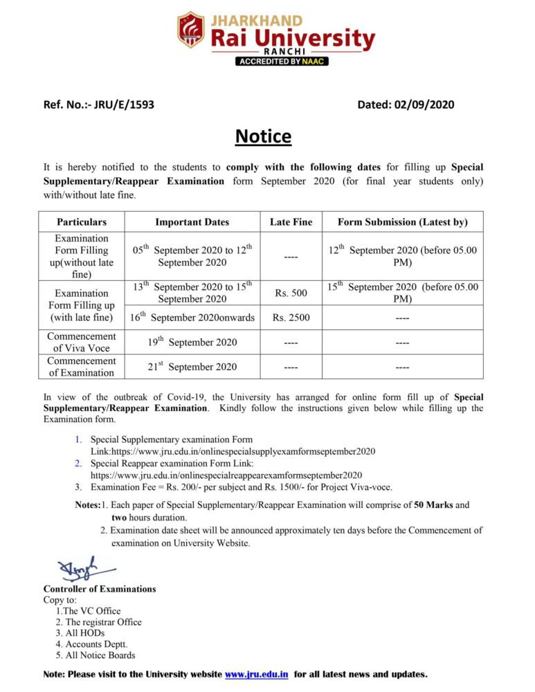 Special Supple & Reappear Exam Notice Sept 20 - Jharkhand Rai University (JRU), Ranchi